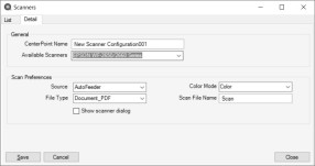 - In the Scan File Name, enter a default file name for your scanned documents. The file name will originally display as Scan. CenterPoint automatically appends a unique identifier to the default name when your document is attached to the transaction. For example, ScanC793.pdf or ScanE072.png.