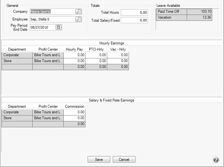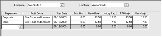 - Enter the different variables for each employee, for example the employee in this example is paid a different rate when they work in the Corporate department for the Bike Tour and Lessons profit center than when they work in the Store department.