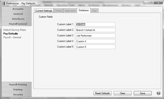 The Pay Defaults preference allows you to set the labels to be used for the five custom fields available to a Pay Default. These labels will be displayed when you modify the custom fields in the Setup > Payroll Details > Pay Defaults > Custom Fields Tab which allows you to enter up-to five custom pieces of information associated with the Pay Default item and can be added as a column on the . The labels can also be displayed by adding the Custom 1 - 5 columns to Setup > Payroll Details > Pay Defaults and can be added to the Processes > Time Sheets > Detail button > Pay Default lookup. Each field can hold up-to 50 characters. Labels for each field come from and can be configured in this preference.
