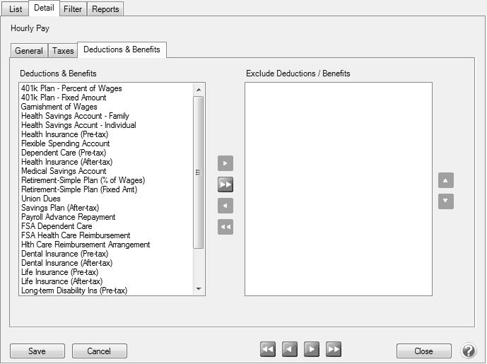 - On the left side of this screen, all of the deductions/benefits that have been setup display. To exclude a deduction or benefit from this earning, in the Deductions & Benefits column, highlight the deduction/benefit and use the arrow keys in the middle of the screen to move the deduction or benefit to the Exclude Deductions / Benefits column on the right side of the screen. The default for newly added deductions/benefits would be to calculate them on this earning. You may have to revisit this screen if additional benefits and deductions are added after adding this earning.