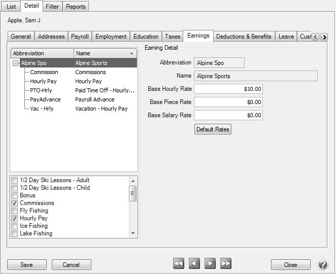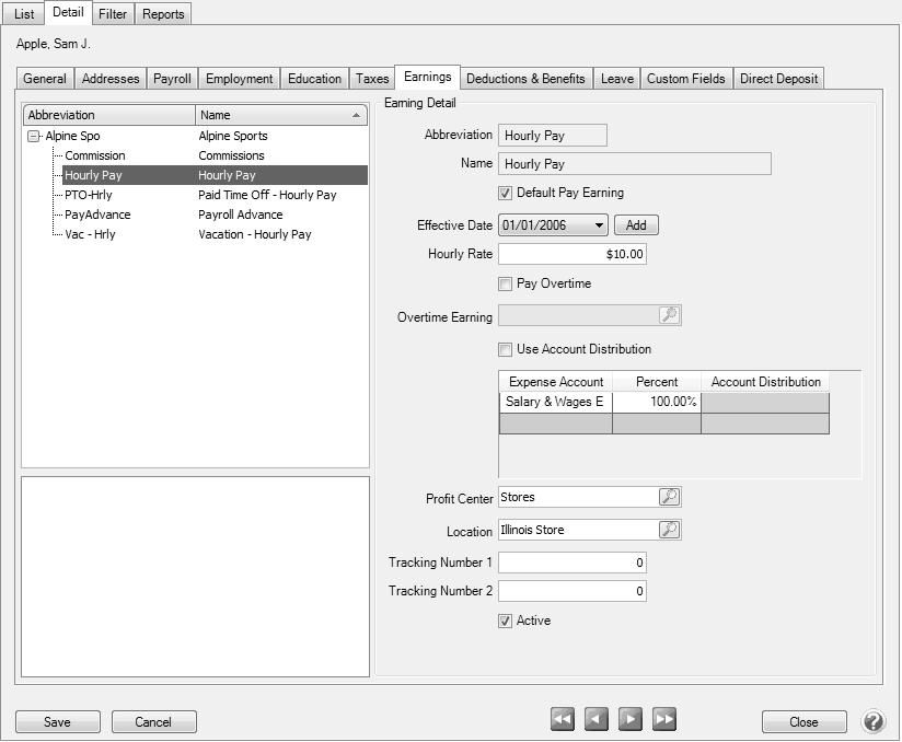 - Click Save to save the earning and return to the List tab, or click Close to save the earning and close the Earnings screen. To return to the List tab without saving the earning, click Cancel. To close the Earnings screen without saving the earning, click the X in the upper-right corner.