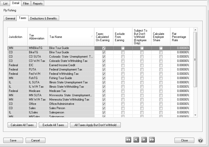 When an earning is created, you determine which taxes are applied and what deductions are taken out for the earning. If you create a new database, some default earnings have been created for you already. You may need to check and see which taxes and deductions are applied. If you add deductions\benefits or taxes you may need to re-visit these screens to make sure the right taxes and deductions\benefits are applied. If you migrated from another product, the earnings should be established for you already.