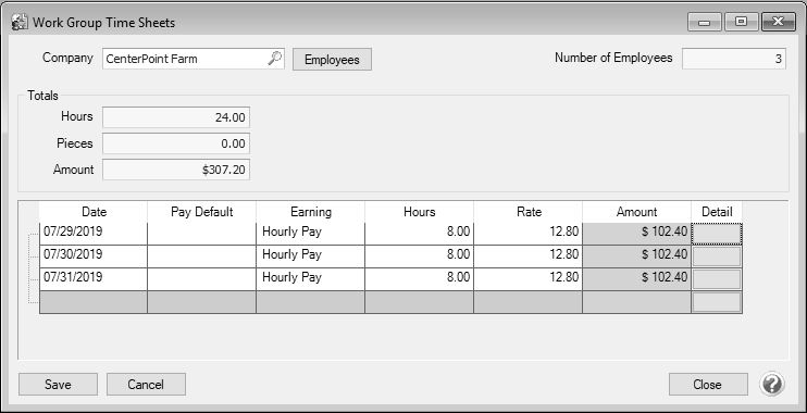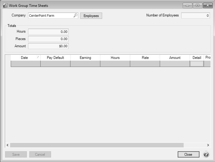 Some employers have groups of employees that do all the same work for the same hours. For example, a produce farmer may have a group of workers who are picking produce in the same field for the same amount of time. Instead of having to enter separate time sheets for each of the employees for the same work and hours, work group time sheets allow you to select a group of employees and enter their time once. That time will then copy to all of the employees’ records.