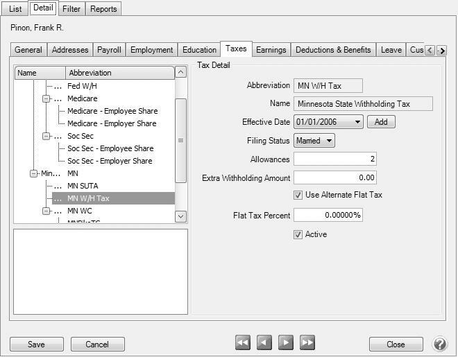 8. In the Tax Detail, enter/verify the state information. If the employee does not have to pay state tax, the state tax must be added on the Taxes tab and the Use Alternate Flat Tax check box should be selected with a rate of zero.