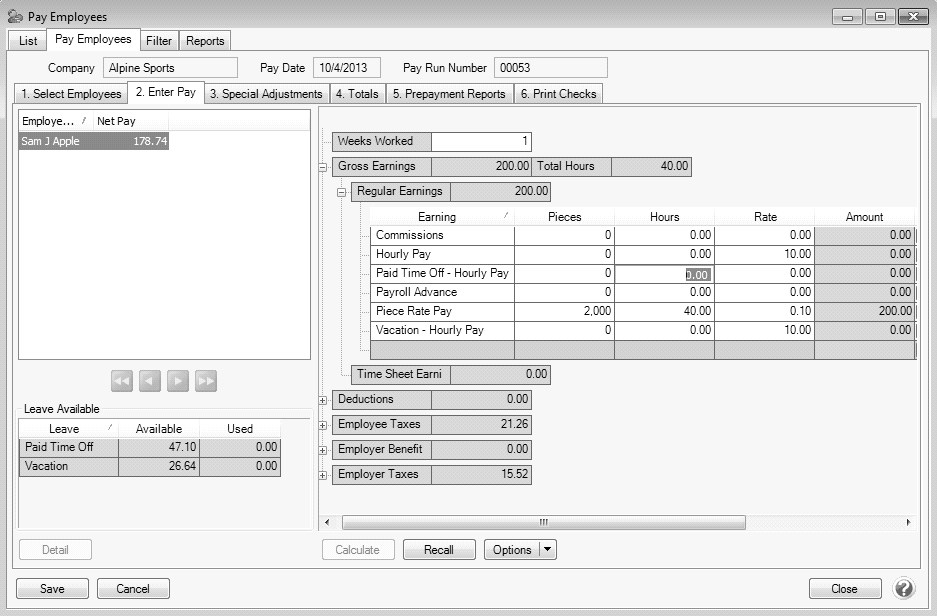 2. Enter the pay run information on the 1. Select Employees tab and 2. Enter Pay tabs as usual.