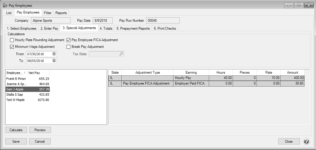 2. Click on the 3. SpecialAdjustments tab if you need to do a minimum wage, hourly rate rounding, pay employee FICA, or break pay adjustment.