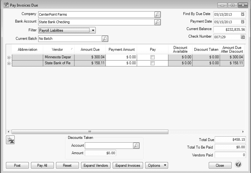 When a payroll is processed that deducts monies (taxes, child support deductions, etc.) which will in turn be paid to another party, the system will automatically create liability invoices for those amounts. The following steps explain how to select these invoices for payment and print the checks. Invoices can be selected for payment based on their Due Date, Discount Date or Invoice Date.