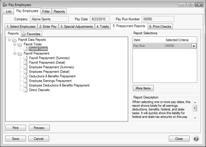 1. If desired, run a Payroll Prepayment report from the 5. Prepayment Reports tab to verify data entry prior to posting and/or printing. Each report will automatically filter to the current pay run when selected. Select the report and click Print or Preview to display the report. Reports function as they do anywhere else in the system, supporting favorites and customization.