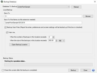 Tip: Define a Preference that will automatically display the Backup screen each time you exit CenterPoint (just as if you selected File > Backup Database). To set the Backup preference: