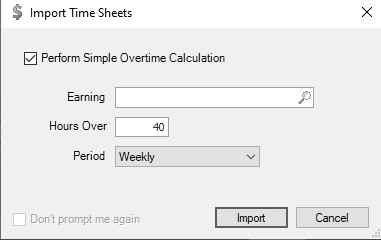 - Select the Perform Simple Overtime calculation to move the hours over the overtime threshold from the time sheet to the overtime earning specified for the employee(s) in the pay run. The setting will be saved as a preference and recalled for future time sheet imports. If you do not select the check box, the Don't prompt me again selection will display and if selected, the Import Time Sheets will not display.