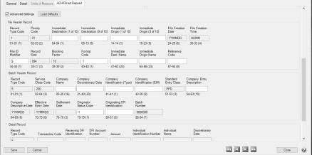 • Select the optional Advanced Settings check box to activate the Advanced Direct Deposit File Configuration section of the screen where you can see a representation of the File Header and Batch Header records included in a Direct Deposit file and customize the values. Click the Load Defaults button to set the file configuration based on your current selections in the upper portion of this screen. Use the vertical scroll bar to display all of the Advanced Settings. Fields that are read-only display values from CenterPoint when the file is generated. The editable fields can be modified to customize values and will be used when the Direct Deposit file is generated. Each field has a label identifying its purpose, position in the file, and field length, (in parenthesis), all per the NACHA file format definition, for example the Immediate Destination field is at character position 4 through 13 and is 10 characters long.