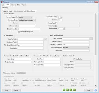 Note: If the Processing Bank Account Number is not entered on the ACH/Direct Deposit tab, the Bank Account Number from the Detail tab in this screen will be used instead.