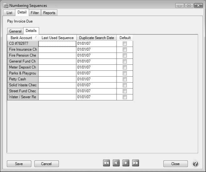 • If the Bank Account check box is selected on the Sequences Detail General tab, the Bank Account column will display all active bank accounts. If both the Company/Fund and Bank Account check boxes are selected on the Sequences Detail General tab, the Company/Fund and Bank Account columns will display all valid combinations of active companies/funds and bank accounts.