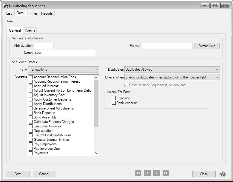 Numbering sequences are used to maintain check numbers, invoice numbers, bank deposit numbers, etc. A default sequence is added to your database for each transaction screen or maintenance/setup screen (where applicable). You can maintain different sequences for various transaction entry and maintenance/setup screens. An example use is for a manual check number sequence and a printed check number sequence.