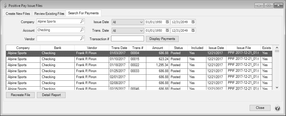 3. To review created files, click the Review Existing Files tab, select the Company/Account Number combination and Issue Date or date range, and then click Display Results. Select a file and click one of the buttons to: