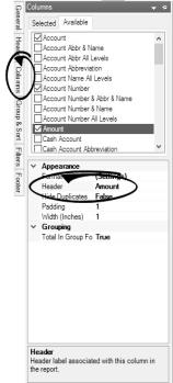 2. Click on the column to be modified and the Appearance information will be displayed below.