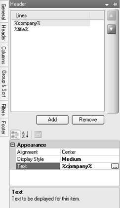 Enter the content to display for the line.This can be a simple line of text (the text does not wrap to multiple lines), or it can contain one or more predefined items representing certain information about the report; for example; “%title%” inserts the report’s title into the content. Clicking the ellipse button