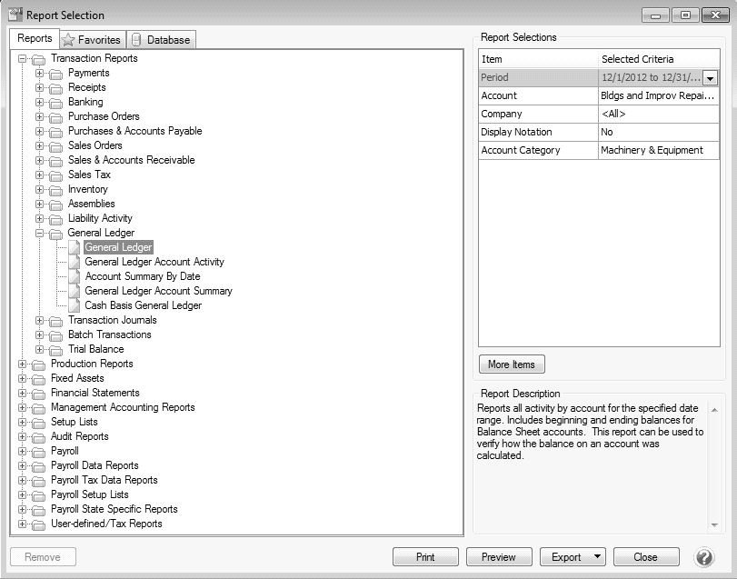 The reports in CenterPoint allow your data to be presented in a way that is meaningful to your organization. All of the standard reports can be filtered and modified for maximum flexibility in reporting. Reports you use on a regular basis can be organized on Favorites, Database Favorites, and Network Favorites tabs to make them easier to locate and print/preview. You can also setup batches of reports to all generate at the same time to make monthly or quarterly reporting easier.
