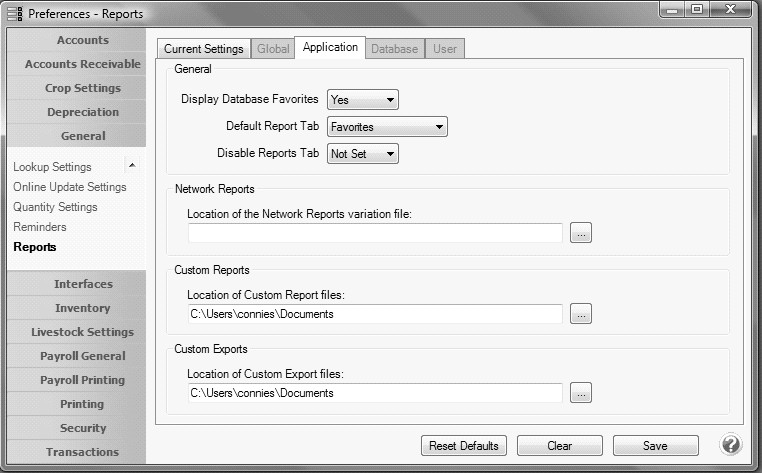 3. If you want only your Favorites to display when you select Reports > Reports, select File > Preferences > General > Reports, click on the Application tab, and in the Disable Reports Tab box, select Yes.