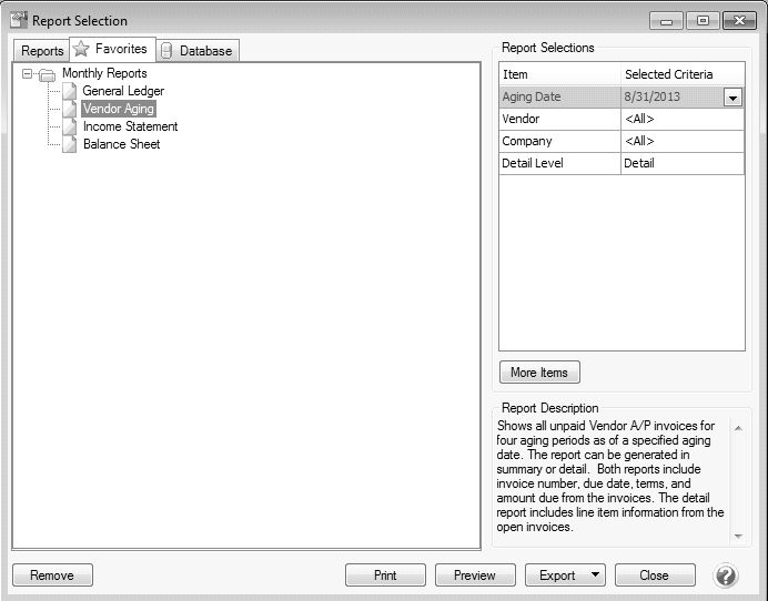 Note: If a system-supplied report has security restrictions for users (you can restrict users from viewing/printing specific reports), the user will also be restricted from any favorites based on the system-supplied report. Favorites created prior to version 6.54.5 will need to be recreated to have security restrictions applied. See the Users and Security topic for information about creating users, user groups, and setting security policies.