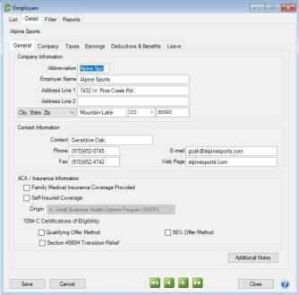 - Screen 2 - Setup > Payroll Details > Employers > Taxes tab.