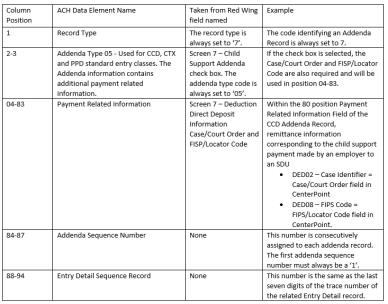 CCD Addenda Record (record type=7) Note: The Addenda record is created only if Screen 7 has the Child Support Addenda check box selected with Case/Court Order and FIPS/Locator information supplied.