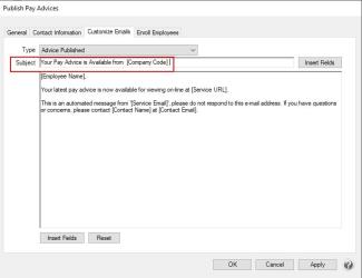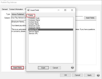 • Select the Field to insert, and then click Insert. The selected Field will display in between square brackets, for example the Subject below was edited to "Your Pay Advice is Available from [Company Name]".