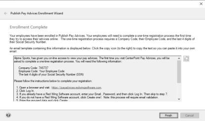 • An email message will be sent informing the selected employees that in order for your employees to access their online pay advices, they must register at payadvices.redwingsoftware.com with your Registered Subscriber Code, their Employee Code, and the last four digits of their Social Security Number. This information is in the default Employee Enrollment email message on the Customize Emails tab.