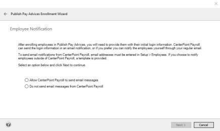 • After enrolling employees in Publish Pay Advices, you will need to provide them with their initial login information. This can be done outside of CenterPoint with a template provided to you or if you prefer, CenterPoint can send the login information to employees via email which requires email address to be entered in Setup > Employees.