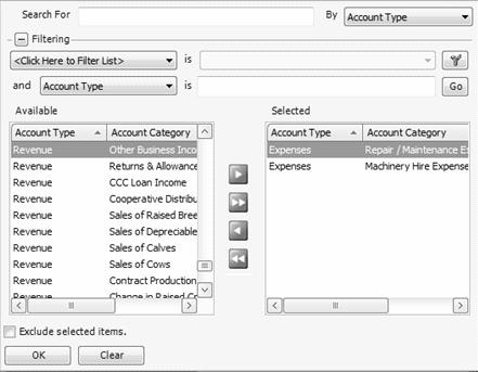 1. Select Account Category in the Report Selections. Select all the categories where you have used associated accounts. In our example, we are selecting the repair accounts. Move the account categories from the left column to the right column with the right arrow.