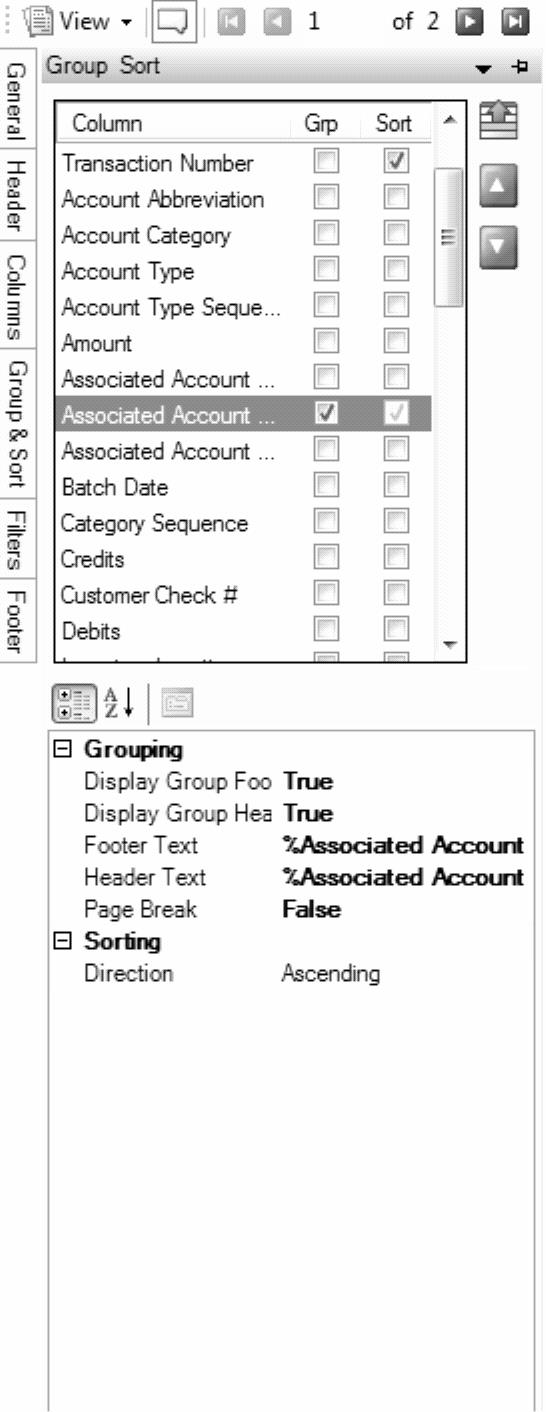 1. Select the Group/Sort tab on the left. Put a check mark in Group and Sort in the Associated Account Name field.