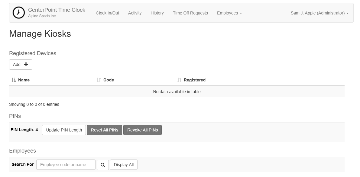 1. From the Manage Kiosks screen, under Employees, in the Search For box, enter the employee abbreviation or employee name that you wish to revoke a PIN for and then click the Search icon or click Display All.