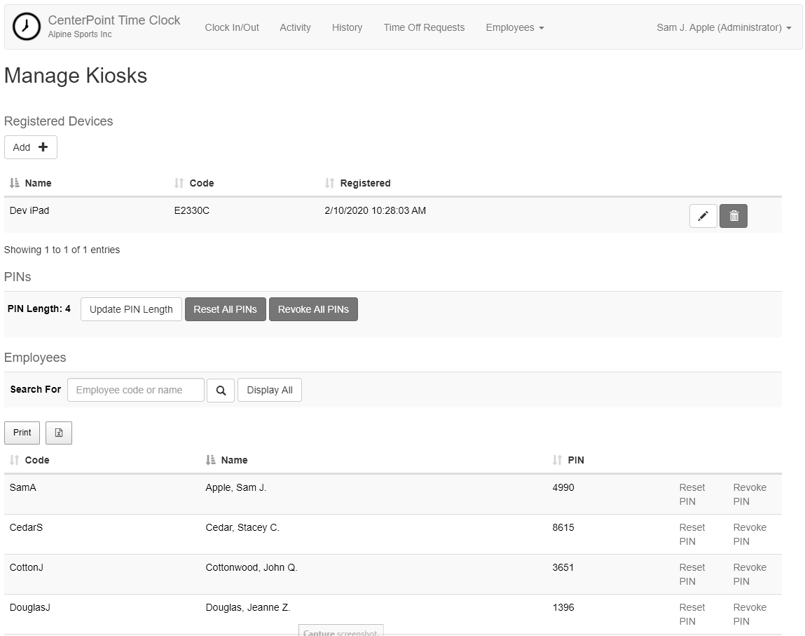 • Shared Kiosk - The Kiosk is for employers who require centralized clock in/clock out capabilities for their employees. Employees receive a pin from their employer, which allows them to clock in and out on a shared device. No employee setup is required for the kiosk, since it’s pulled from within CenterPoint Payroll.