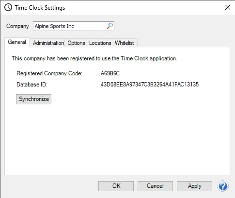 1. On the General tab, click Register and wait while the time clock registration and synchronization takes place. When it is complete, a Registered Company Code will display. Take note of the Registered Company Code. The Registered Company Code is used if your employees will be using the website or app. The Company Code is not required for the Kiosk setup.