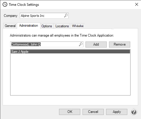 1. On the Administration tab, Administrators are assigned to the time clock. Administrators have full rights over all employee time entries as well as time clock setup. Select the employee and then click Add. You can add as many Administrators as necessary for your company. If you are using the CenterPoint Time Clock Kiosk, you will need to add at least one Administrator. To remove Administrators, select the employee in the lower list and click Remove.