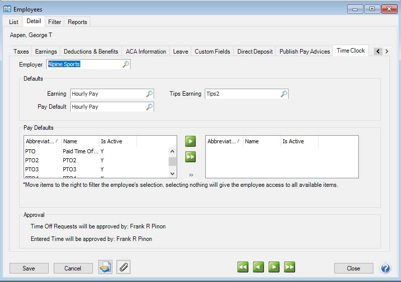 3. Under Pay Defaults, move the pay default(s) that are applicable to this employee to the right side of the screen, for example, you may have 20 hourly earning codes, but your employee only works in three of the 20. Typically, you will assign the pay defaults that are equivalent to the earnings on the Earnings tab of the employee.