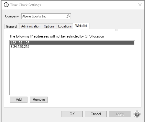 3. If you are restricting clock in/clock out entries within the radius of specific GPS locations, select the Whitelist tab to allow exceptions to be made for certain IP addressess so they are not stopped by the GPS restrictions, for example for employees who clock in/out from computers in your office rather than from a mobile device.