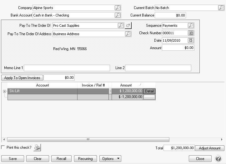 1. Back on the Payment screen, enter the Amount for the purchase of this fixed asset.