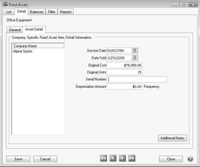 • Select the Asset Detail tab to complete the applicable item details (Original Cost, Serial Number, Original Units (used to indicate the original number of units purchased with the asset), etc.).