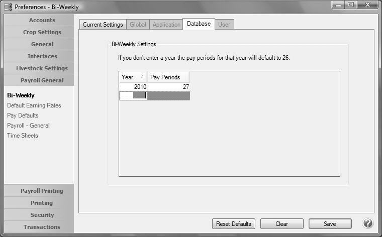 - Select File > Preferences > Payroll > Bi-Weekly Pay Periods > Database tab.