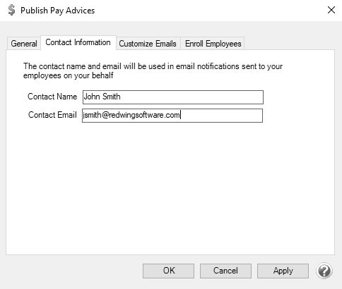 A: The contact email address used in the notifications is set in Setup > Payroll Details > Publish Pay Advice Settings > Contact Information tab in the Contact Email box. The email address, as well as the Contact Name can be changed.