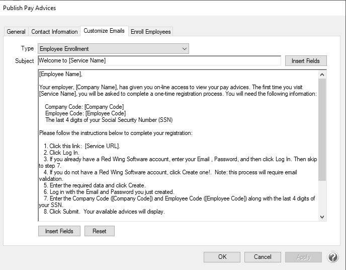 - An email message will be sent informing the selected employees that in order for your employees to access their online pay advices, they must register at payadvices.redwingsoftware.com with your Registered Subscriber Code, their Employee Code, and the last four digits of their Social Security Number. This information is in the default Employee Enrollment email message on the Customize Emails tab.