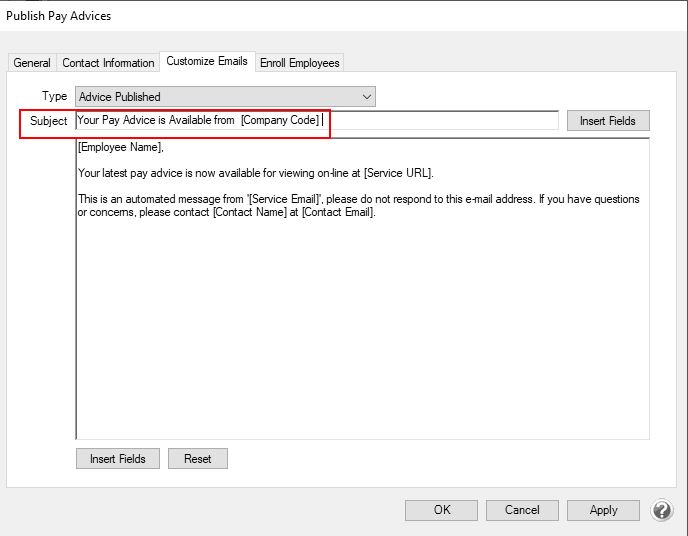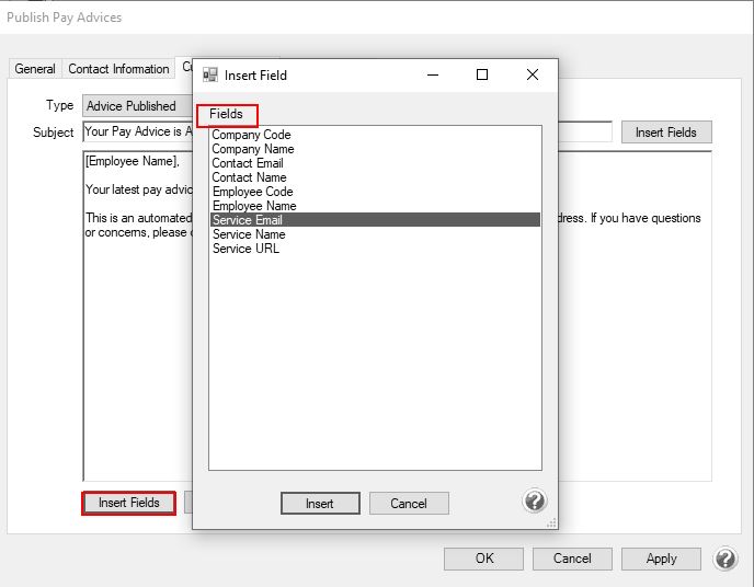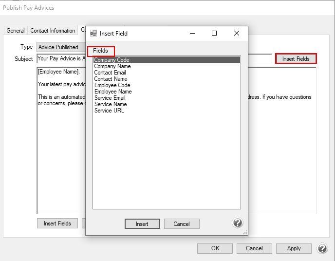 - Select the Field to insert, and then click Insert. The selected Field will display in between square brackets, for example the Subject below was edited to "Your Pay Advice is Available from [Company Name]".