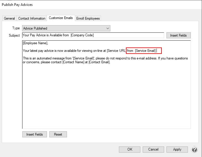 - Select the Field to insert, and then click Insert. The selected Field will display in between square brackets, for example the body of the email was changed to include the was edited to include the Service Email field, for example "Your latest pay advice is now available for viewing on-line at [Service URL] from [Service Email]."