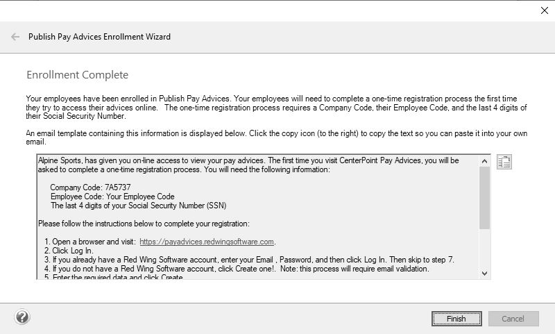 , open your Email software, and press Ctrl + V to paste the text into your email, and then add your contact information. Send the email to the employees that need to be notified about the registration process. - Click Finish.