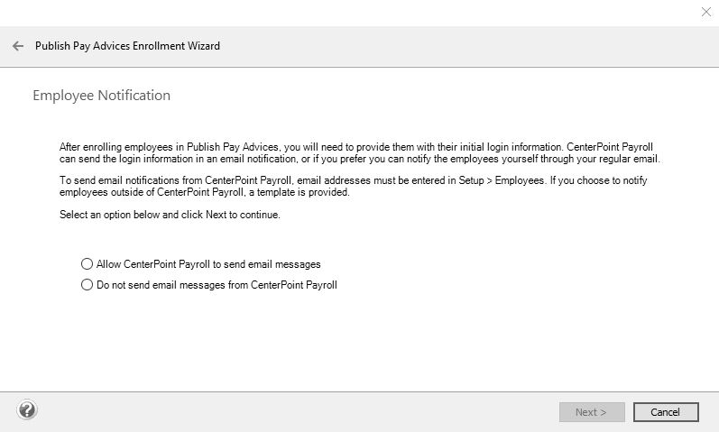 After enrolling employees in Publish Pay Advices, you will need to provide them with their initial login information. This can be done outside of CenterPoint with a template provided to you or if you prefer, CenterPoint can send the login information to employees via email which requires email address to be entered in Setup > Employees.