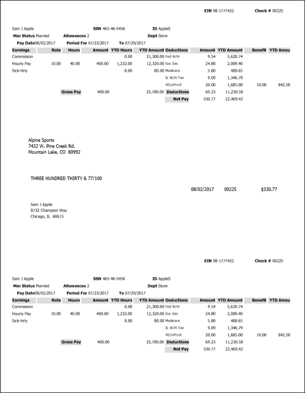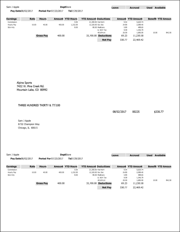Printing Payroll Checks Preference - Check Type and Stub Type Examples for Stub/Check/Stub