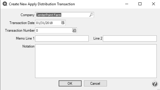 1. In the Transaction Number box, enter the transaction number for the apply distribution transactions or click the sequence number icon and select the next available sequence number. See the Maintaining Sequence NumbersMaintaining Sequence Numbers topic for more information.