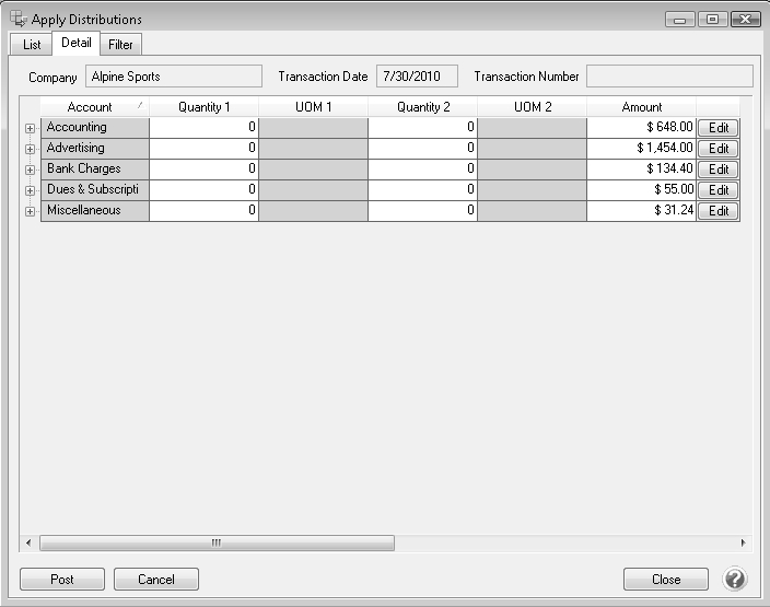 1. If you wish to change the distribution amounts in the Amount column before posting, type over the existing amount. Click Edit to add/change/remove account distribution detail lines and recalculate the remaining details (click Reset to set the distribution back to the amounts prior to any changes).