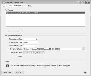 1. On the Processes menu, click Direct Deposit and then click Create Direct Deposit Files or on the Processes menu, point to Payroll, and click Direct Deposit and then click Create Direct Deposit Files.